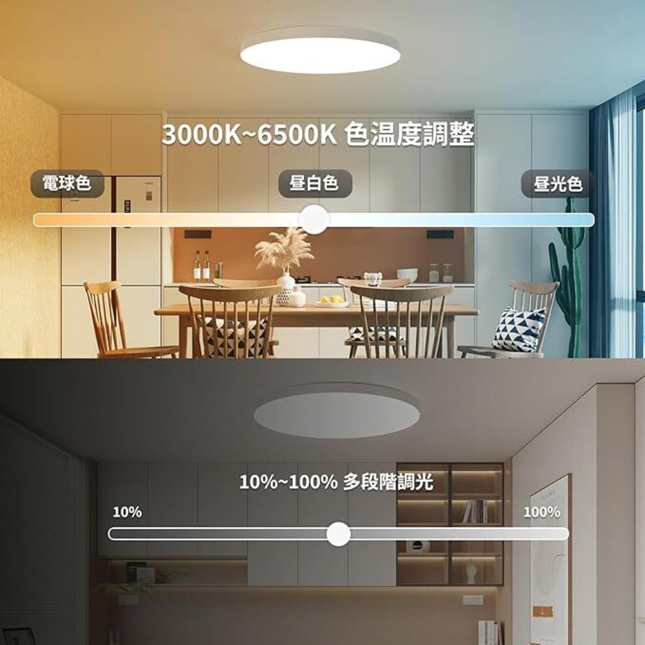 【色温度と明るさも調整可能】専用のリモコンを使用して、LEDシーリングライトの明るさと色温度を簡単に調整することができます。20段階の明るさ調整と10段階の色温度オプションにより、様々なシーンに合わせた照明を作り出すことができます。また、リモコンは前回の設定を記憶するスマートな機能を搭載しているため、常夜灯の設定や調光、色温度の変更後でも、次回点灯時には自動的に前回の設定が適用されます。手間をかけずにお好みの照明環境を再現できる優れた機能です。